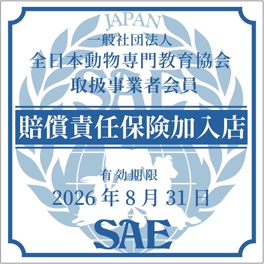 当店は動物愛護管理法によって定められた第一種動物取扱業の登録を適切に行い、全日本動物専門教育協会(SAE)の会員であるとともに、「受託者賠償責任保険」と「施設賠償責任保険」の補償を備えた賠償責任保険に加入しております。